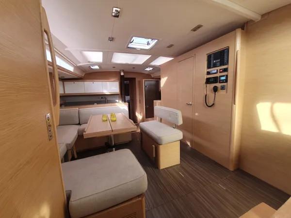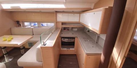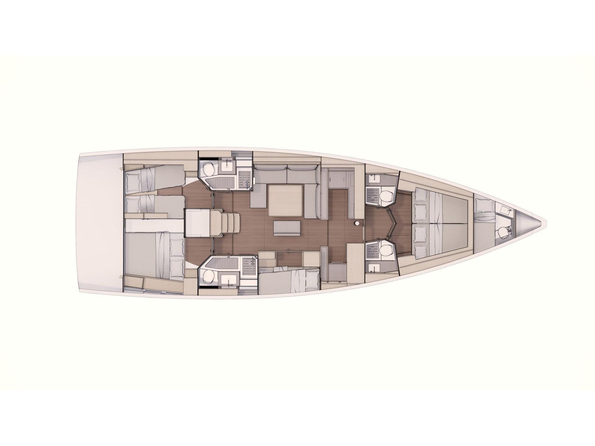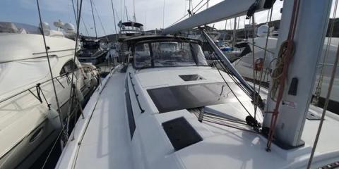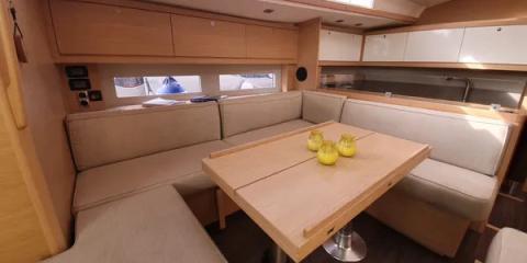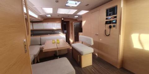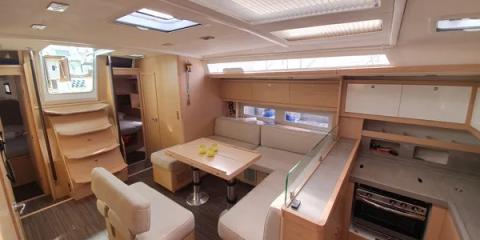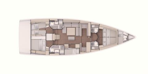 Ce Dufour 530 est disponible à la location au départ de Olympic Marina. Il s'agit d'une version 6 cabines, idéal pour vos vacances.