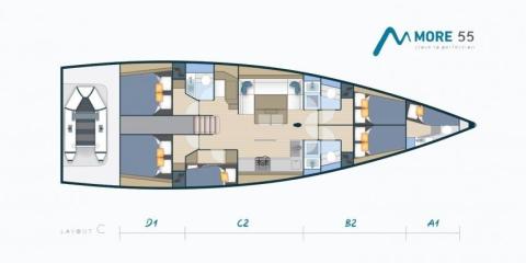 Ce More 55 est disponible à la location au départ de Marina Kaštela. Il s'agit d'une version 5 cabines, idéal pour vos vacances.
